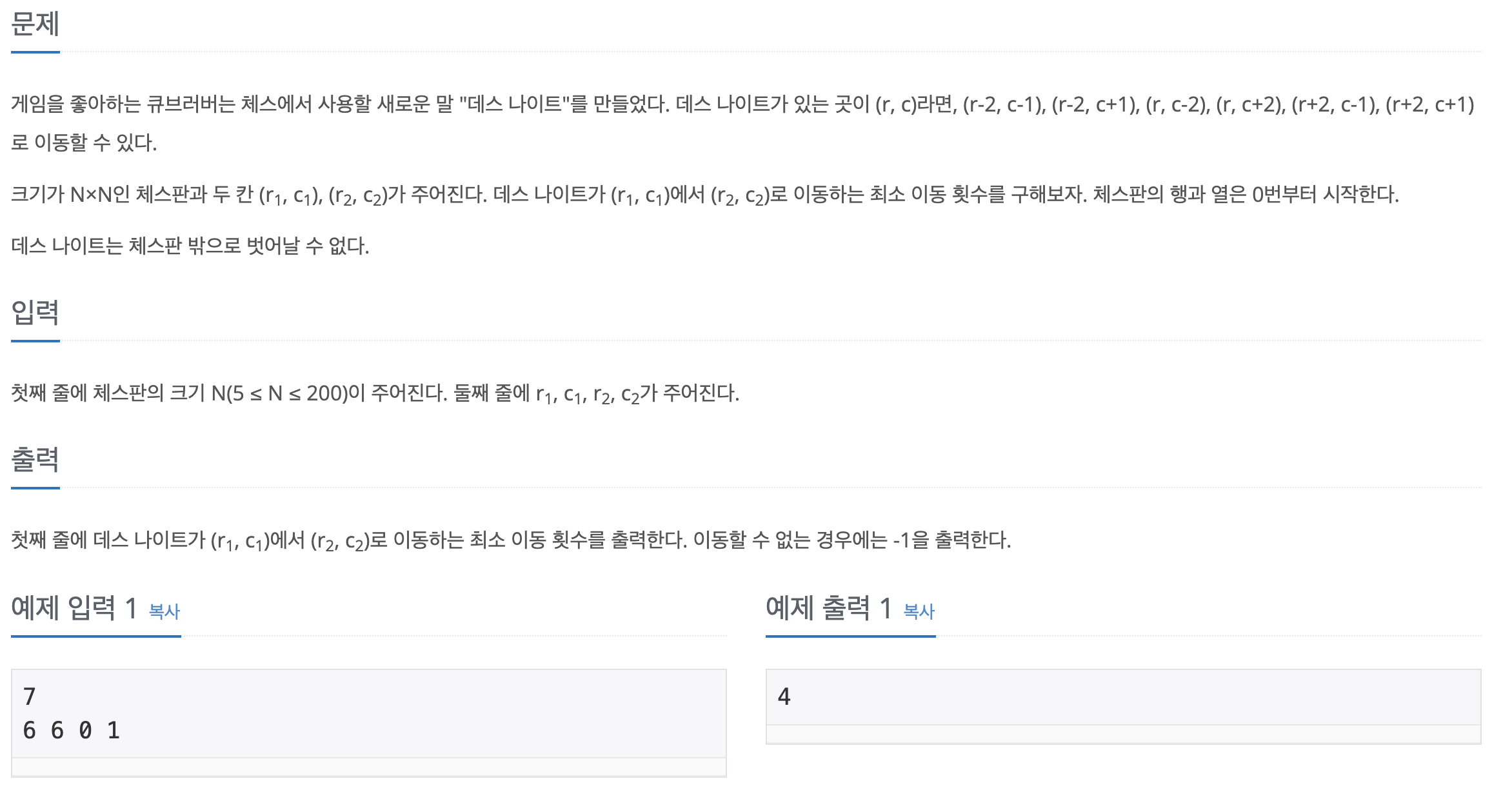크기가 N×N인 체스판과 두 칸 (r1, c1), (r2, c2)가 주어진다. 데스 나이트가 (r1, c1)에서 (r2, c2)로 이동하는 최소 이동 횟수