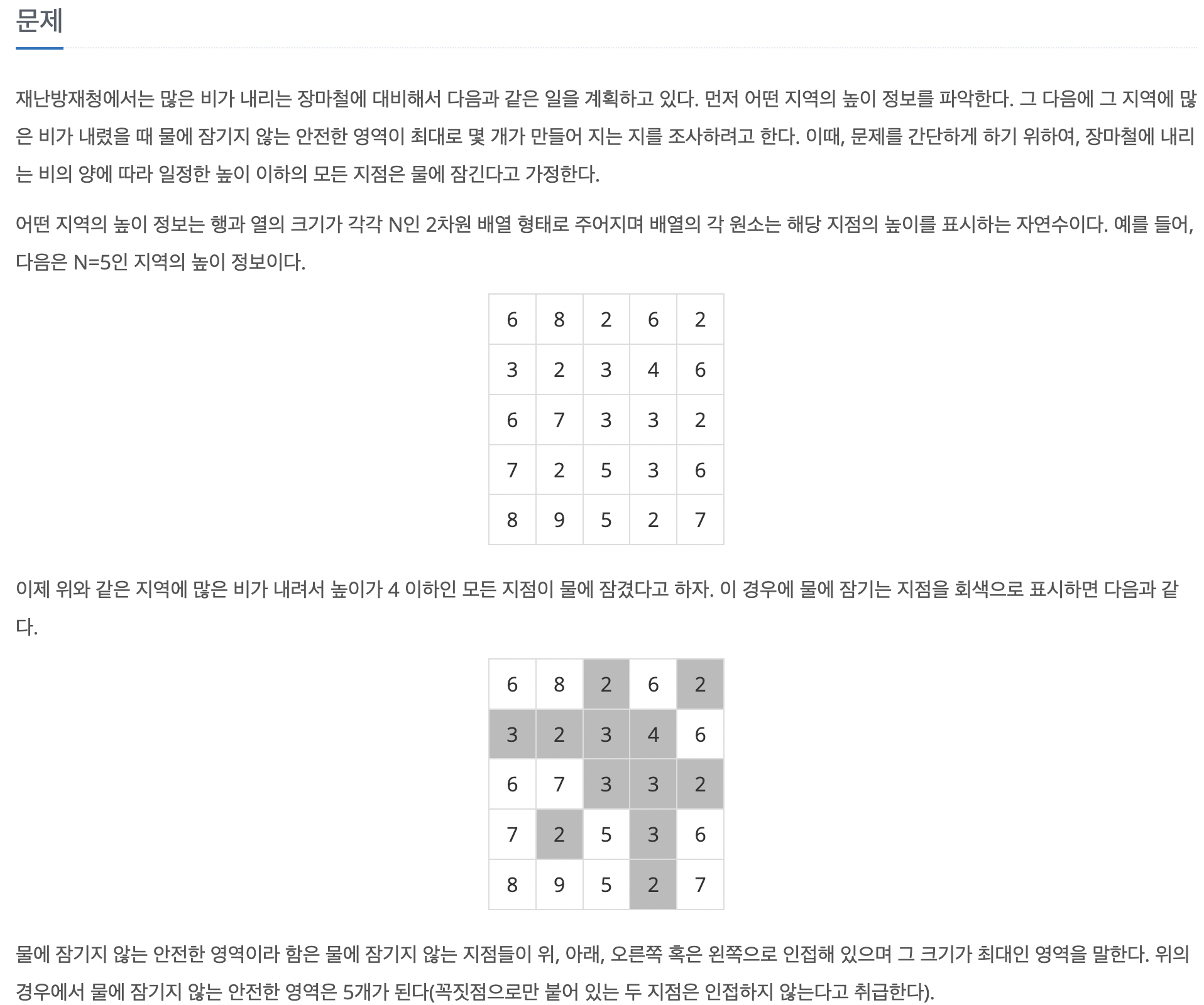 높이보다 낮거나 같으면 침수표시해주고(false), 배열 순회 완료했으면 dfs 이용 갯수 세어준다.
