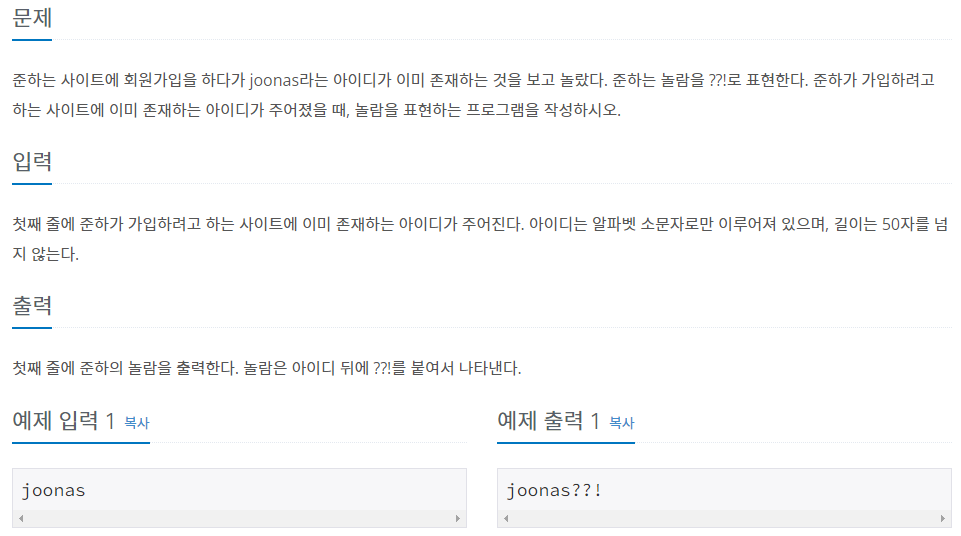 준하는 사이트에 회원가입을 하다가 joonas라는 아이디가 이미 존재하는 것을 보고 놀랐다. 준하는 놀람을 ??!로 표현한다. 준하가 가입하려고 하는 사이트에 이미 존재하는 아이디가 주어졌을 때