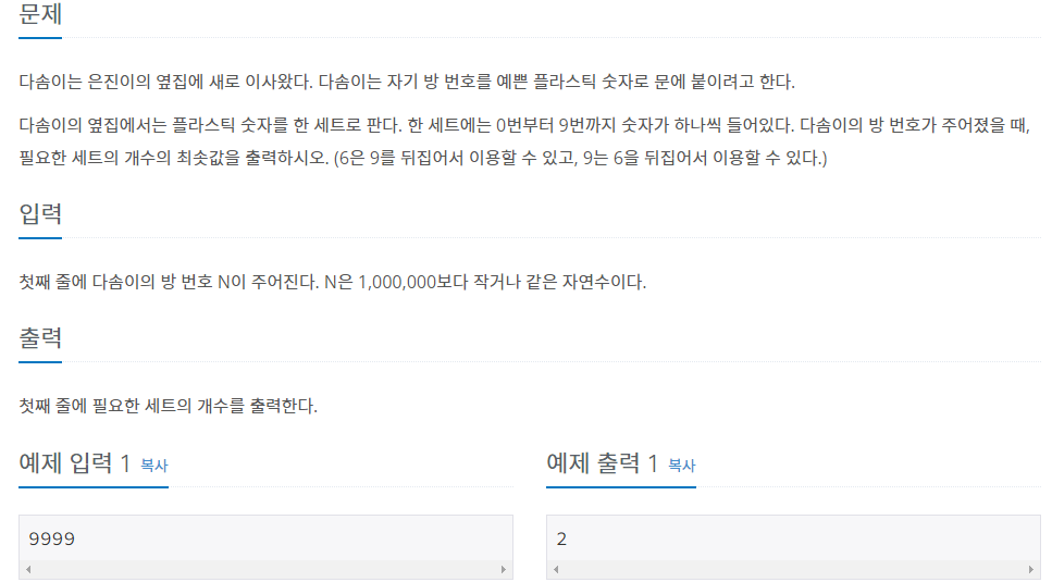 첫째 줄에 다솜이의 방 번호 N이 주어진다. N은 1,000,000보다 작거나 같은 자연수이다.