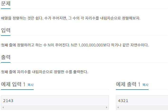 첫째 줄에 정렬하려고 하는 수 N이 주어진다. N은 1,000,000,000보다 작거나 같은 자연수이다.