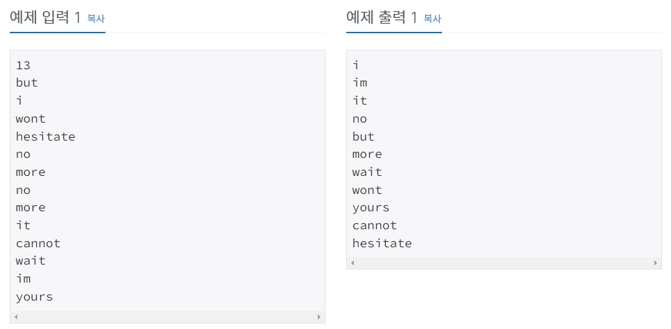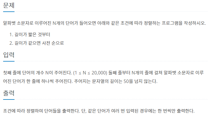 첫째 줄에 단어의 개수 N이 주어진다. (1 ≤ N ≤ 20,000) 둘째 줄부터 N개의 줄에 걸쳐 알파벳 소문자로 이루어진 단어가 한 줄에 하나씩 주어진다. 주어지는 문자열의 길이는 50을 넘지 않는다.