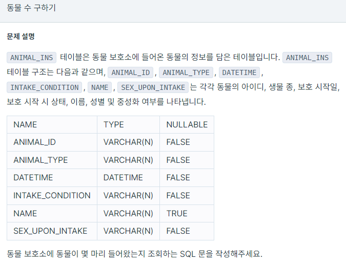 실행 결과로 모든(*) 동물의 개수 나와야 하니까 SELECT COUNT (*)