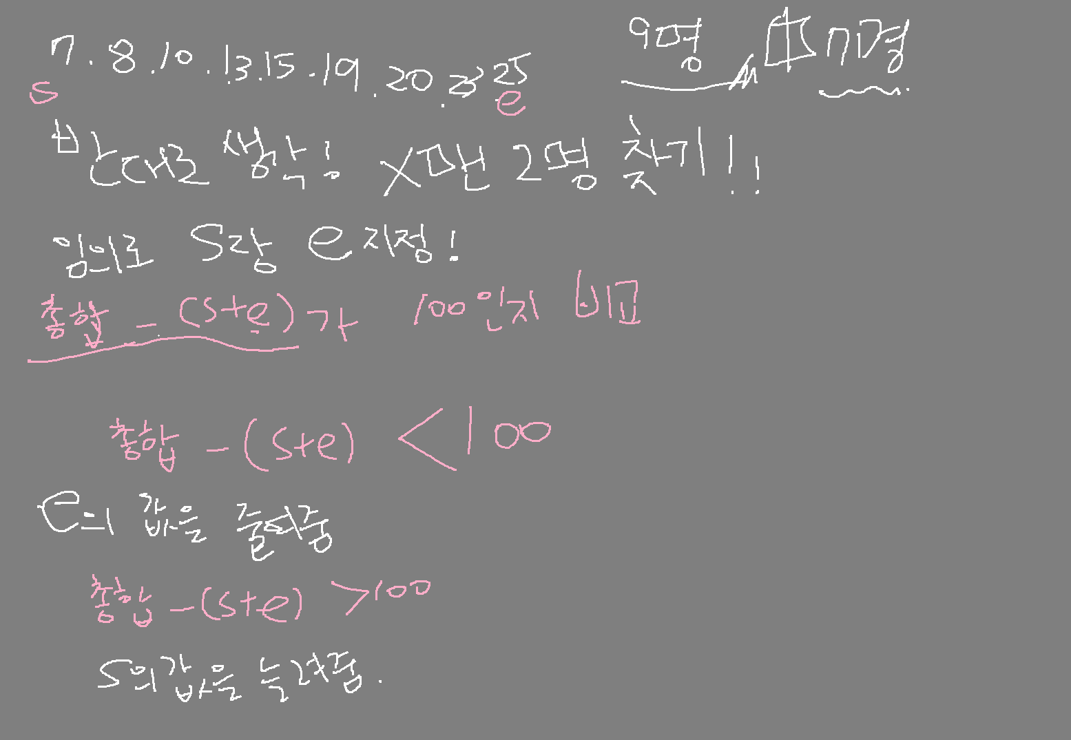 elif (total-arr[s]-arr[e]) < 100: # 총합보다 작을 때