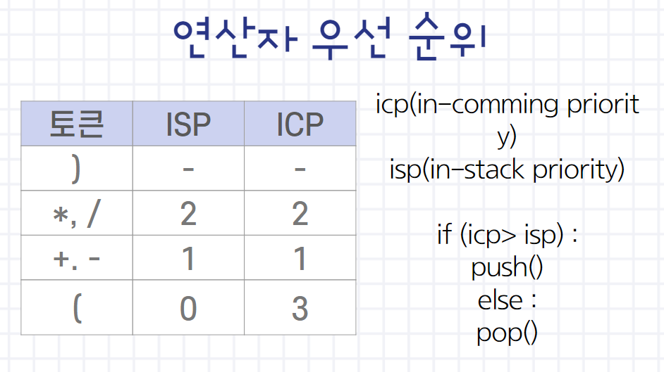 수식은 일반적으로 3가지 표기법으로 표현할 수 있다. 연산자가 피연산자 가운데 위치하는 중위 표기법(일반적으로 우리가 쓰는 방법이다), 연산자가 피연산자 앞에 위치하는 전위 표기법(prefix notation), 연산자가 피연산자 뒤에 위치하는 후위 표기법(postfix notation)이 그것이다. 예를 들어 중위 표기법으로 표현된 a+b는 전위 표기법으로는 +ab이고, 후위 표기법으로는 ab+가 된다.