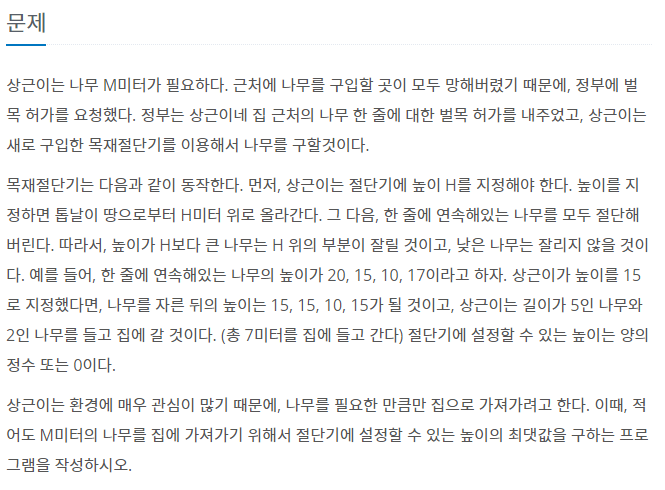 적어도 M미터를 가져가는 높이 H의 최댓값 찾기