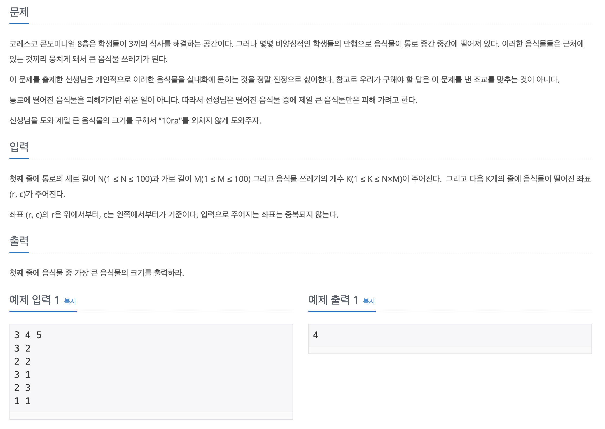 첫째 줄에 통로의 세로 길이 N(1 ≤ N ≤ 100)과 가로 길이 M(1 ≤ M ≤ 100) 그리고 음식물 쓰레기의 개수 K(1 ≤ K ≤ N×M)이 주어진다. 그리고 다음 K개의 줄에 음식물이 떨어진 좌표 (r, c)가 주어진다